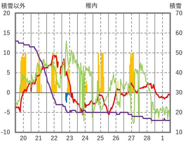 | 日 | 時 | 気温 | 降水 | 風向/風速 | 日照 | 積雪 | 降雪 |
