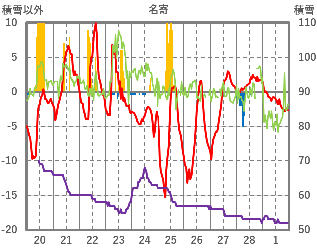 | 日 | 時 | 気温 | 降水 | 風向/風速 | 日照 | 積雪 | 降雪 |