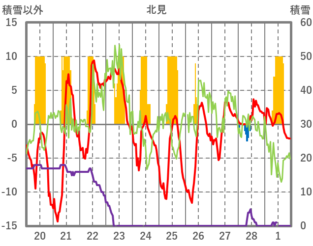 | 日 | 時 | 気温 | 降水 | 風向/風速 | 日照 | 積雪 | 降雪 |
