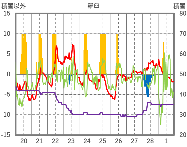 | 日 | 時 | 気温 | 降水 | 風向/風速 | 日照 | 積雪 | 降雪 |