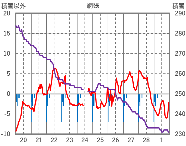 | 日 | 時 | 気温 | 降水 | 風向/風速 | 日照 | 積雪 | 降雪 |