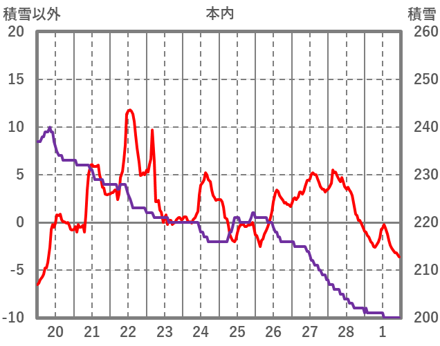 | 日 | 時 | 気温 | 降水 | 風向/風速 | 日照 | 積雪 | 降雪 |
