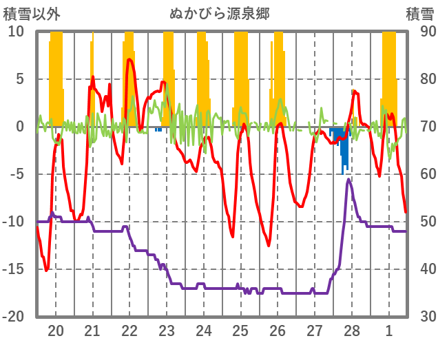 | 日 | 時 | 気温 | 降水 | 風向/風速 | 日照 | 積雪 | 降雪 |