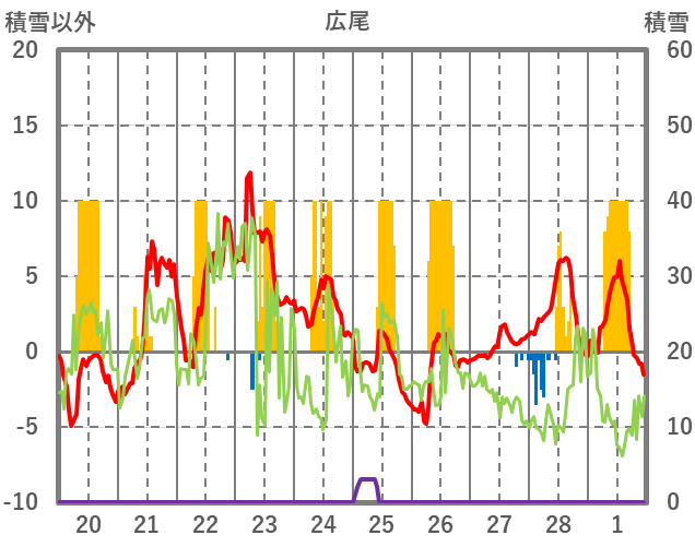| 日 | 時 | 気温 | 降水 | 風向/風速 | 日照 | 積雪 | 降雪 |