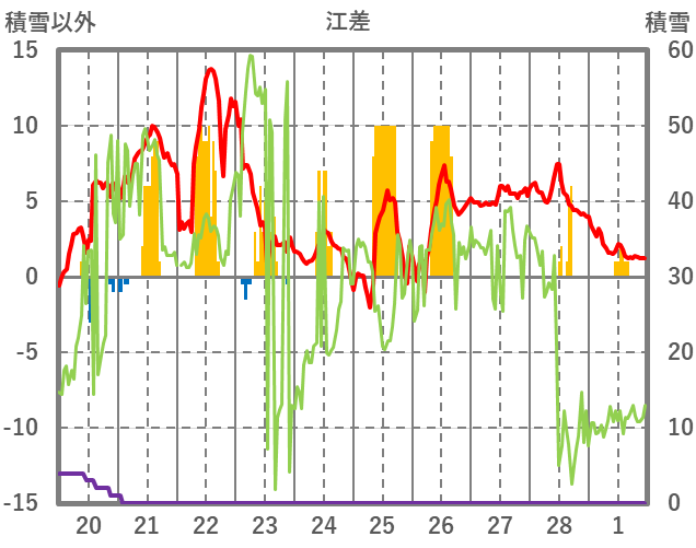 | 日 | 時 | 気温 | 降水 | 風向/風速 | 日照 | 積雪 | 降雪 |