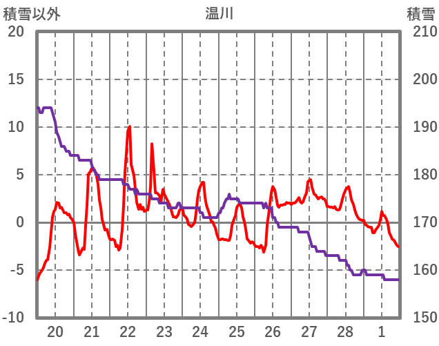 | 日 | 時 | 気温 | 降水 | 風向/風速 | 日照 | 積雪 | 降雪 |