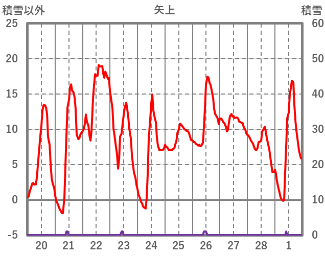 | 日 | 時 | 気温 | 降水 | 風向/風速 | 日照 | 積雪 | 降雪 |