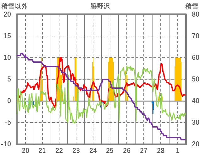 | 日 | 時 | 気温 | 降水 | 風向/風速 | 日照 | 積雪 | 降雪 |