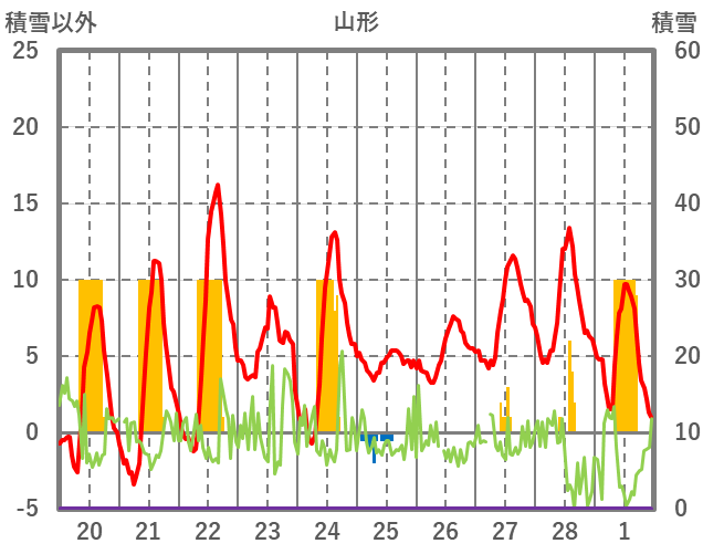 | 日 | 時 | 気温 | 降水 | 風向/風速 | 日照 | 積雪 | 降雪 |