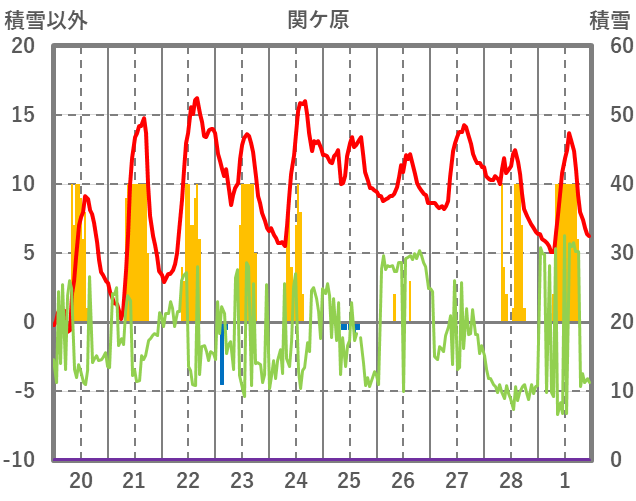 | 日 | 時 | 気温 | 降水 | 風向/風速 | 日照 | 積雪 | 降雪 |