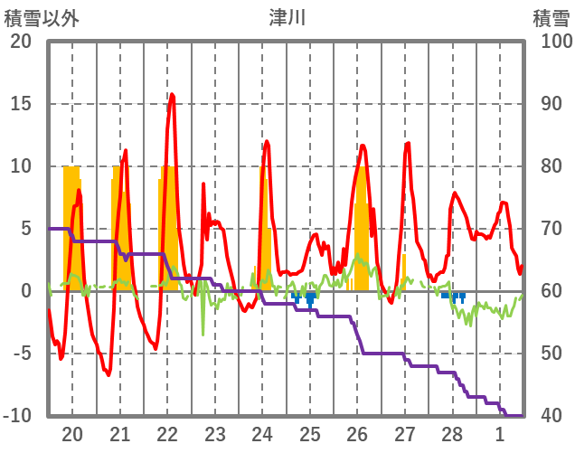 | 日 | 時 | 気温 | 降水 | 風向/風速 | 日照 | 積雪 | 降雪 |