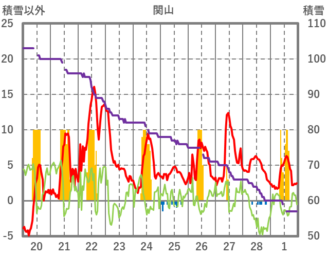 | 日 | 時 | 気温 | 降水 | 風向/風速 | 日照 | 積雪 | 降雪 |