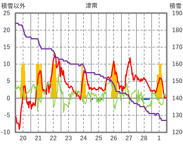 | 日 | 時 | 気温 | 降水 | 風向/風速 | 日照 | 積雪 | 降雪 |