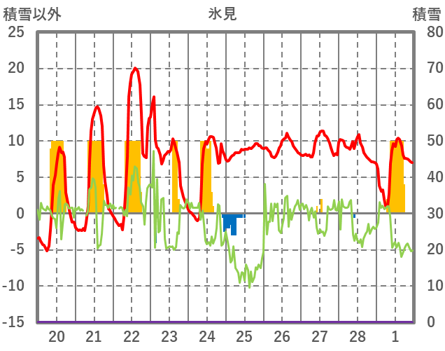 | 日 | 時 | 気温 | 降水 | 風向/風速 | 日照 | 積雪 | 降雪 |