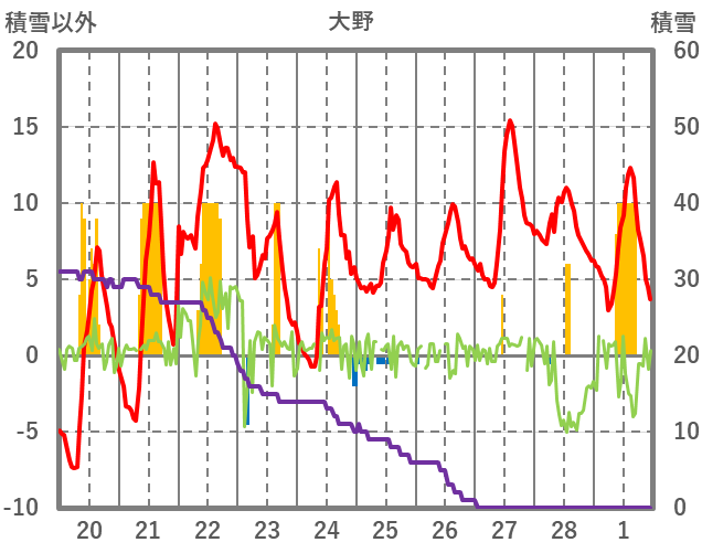 | 日 | 時 | 気温 | 降水 | 風向/風速 | 日照 | 積雪 | 降雪 |