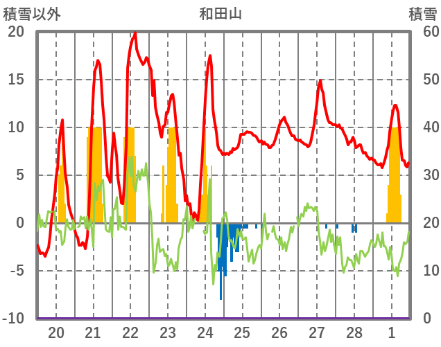 | 日 | 時 | 気温 | 降水 | 風向/風速 | 日照 | 積雪 | 降雪 |