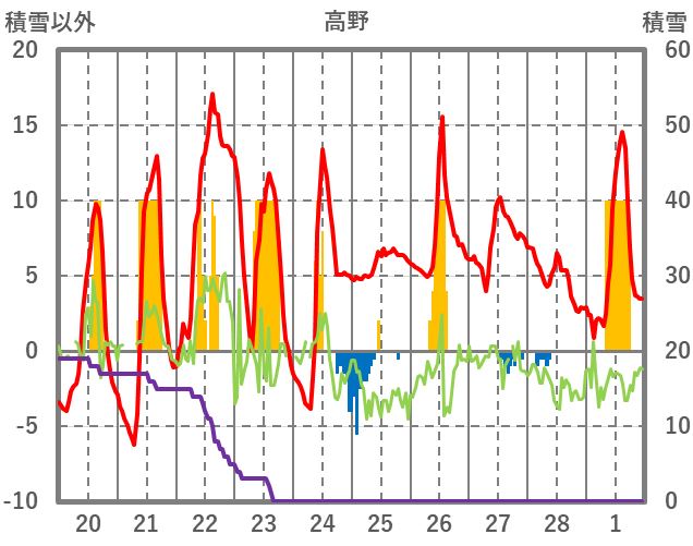 | 日 | 時 | 気温 | 降水 | 風向/風速 | 日照 | 積雪 | 降雪 |