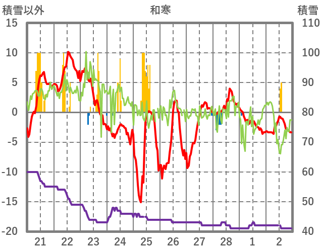 | 日 | 時 | 気温 | 降水 | 風向/風速 | 日照 | 積雪 | 降雪 |