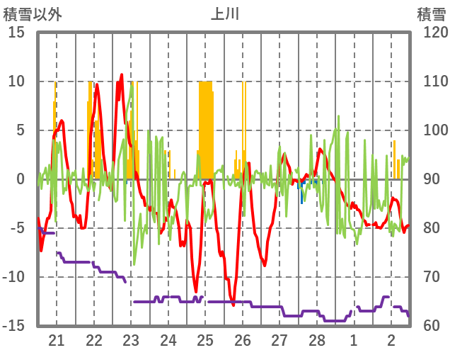 | 日 | 時 | 気温 | 降水 | 風向/風速 | 日照 | 積雪 | 降雪 |