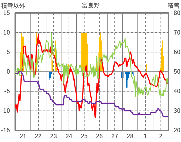 | 日 | 時 | 気温 | 降水 | 風向/風速 | 日照 | 積雪 | 降雪 |