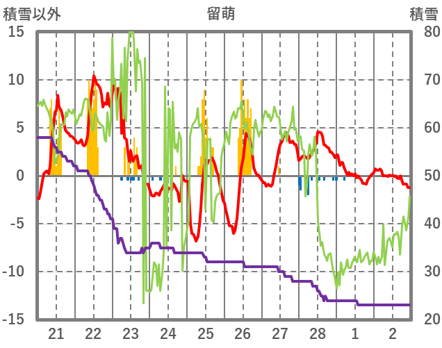 | 日 | 時 | 気温 | 降水 | 風向/風速 | 日照 | 積雪 | 降雪 |