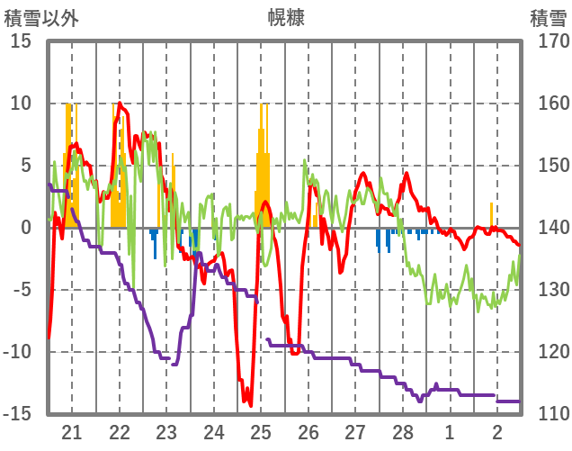 | 日 | 時 | 気温 | 降水 | 風向/風速 | 日照 | 積雪 | 降雪 |