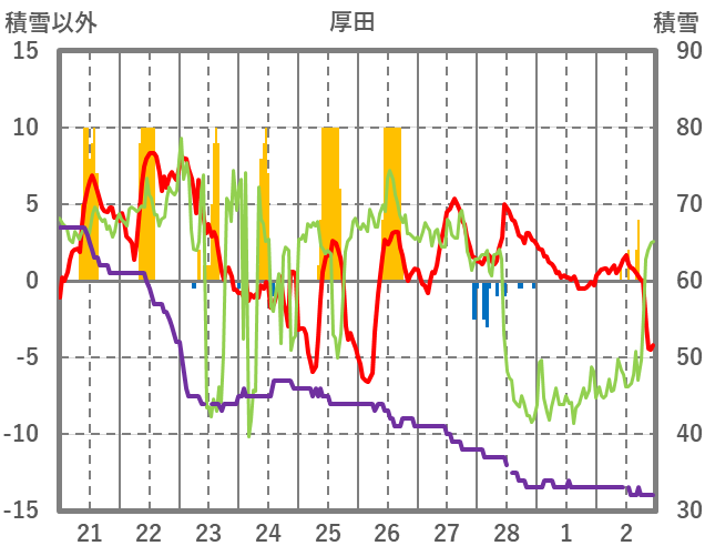 | 日 | 時 | 気温 | 降水 | 風向/風速 | 日照 | 積雪 | 降雪 |