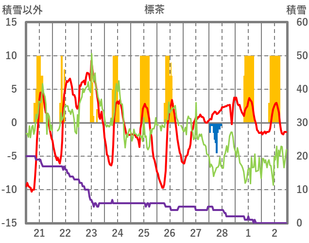 | 日 | 時 | 気温 | 降水 | 風向/風速 | 日照 | 積雪 | 降雪 |