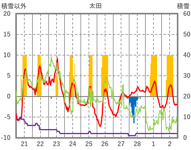 | 日 | 時 | 気温 | 降水 | 風向/風速 | 日照 | 積雪 | 降雪 |