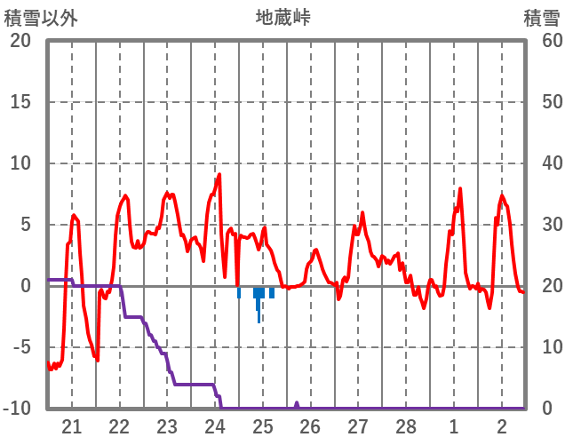 | 日 | 時 | 気温 | 降水 | 風向/風速 | 日照 | 積雪 | 降雪 |