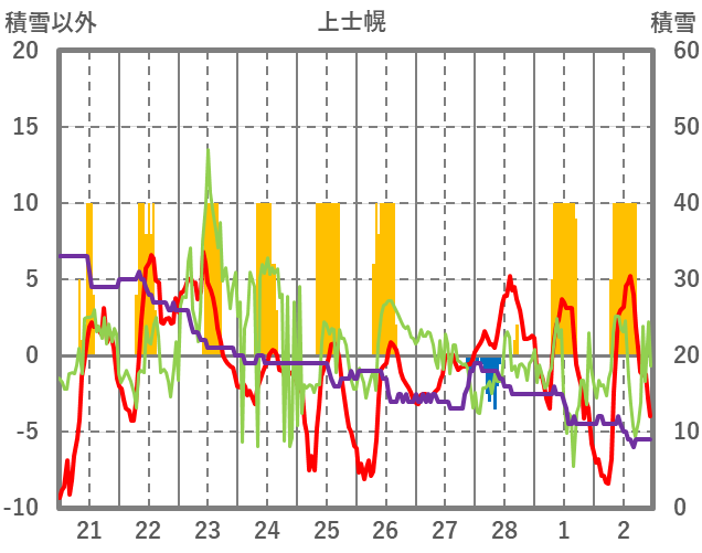 | 日 | 時 | 気温 | 降水 | 風向/風速 | 日照 | 積雪 | 降雪 |