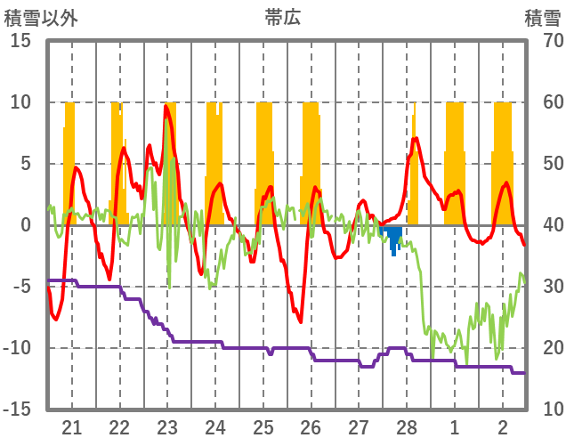 | 日 | 時 | 気温 | 降水 | 風向/風速 | 日照 | 積雪 | 降雪 |