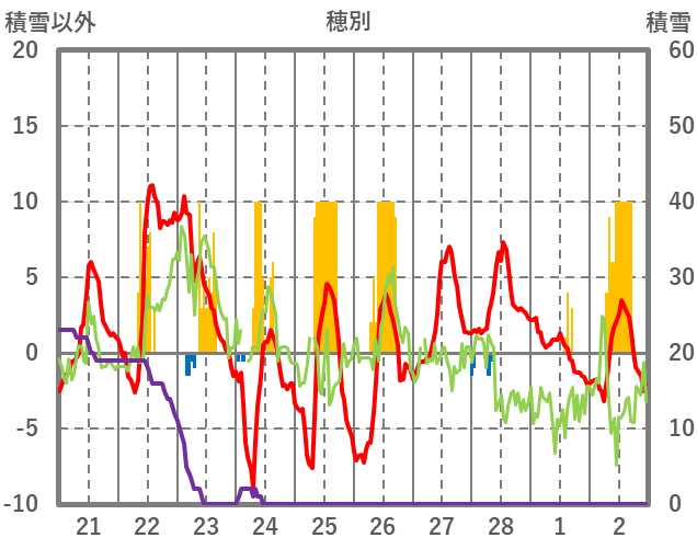 | 日 | 時 | 気温 | 降水 | 風向/風速 | 日照 | 積雪 | 降雪 |