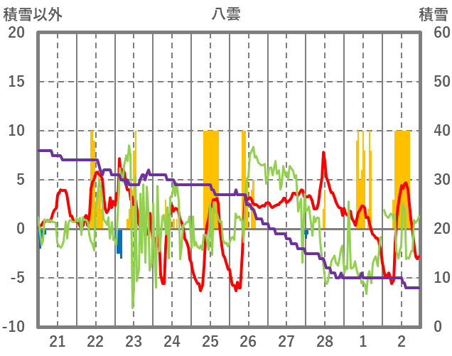 | 日 | 時 | 気温 | 降水 | 風向/風速 | 日照 | 積雪 | 降雪 |
