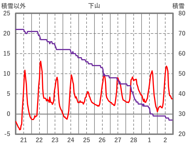 | 日 | 時 | 気温 | 降水 | 風向/風速 | 日照 | 積雪 | 降雪 |