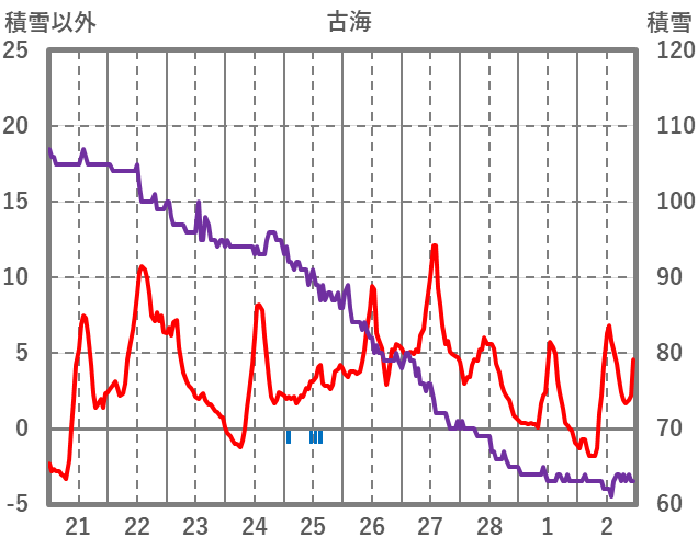 | 日 | 時 | 気温 | 降水 | 風向/風速 | 日照 | 積雪 | 降雪 |