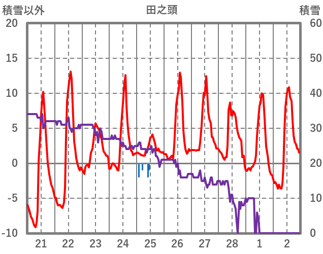 | 日 | 時 | 気温 | 降水 | 風向/風速 | 日照 | 積雪 | 降雪 |