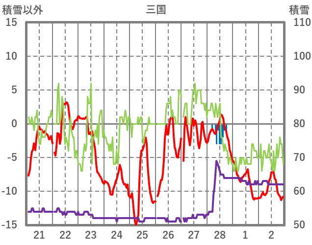 | 日 | 時 | 気温 | 降水 | 風向/風速 | 日照 | 積雪 | 降雪 |