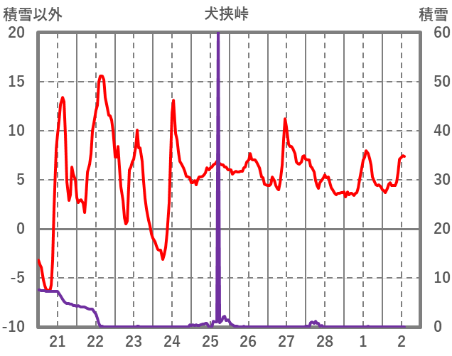 | 日 | 時 | 気温 | 降水 | 風向/風速 | 日照 | 積雪 | 降雪 |