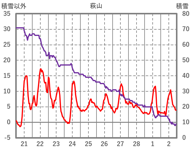 | 日 | 時 | 気温 | 降水 | 風向/風速 | 日照 | 積雪 | 降雪 |