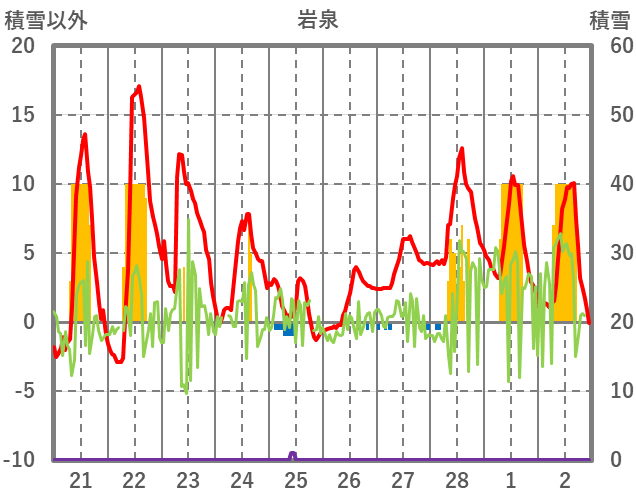 | 日 | 時 | 気温 | 降水 | 風向/風速 | 日照 | 積雪 | 降雪 |