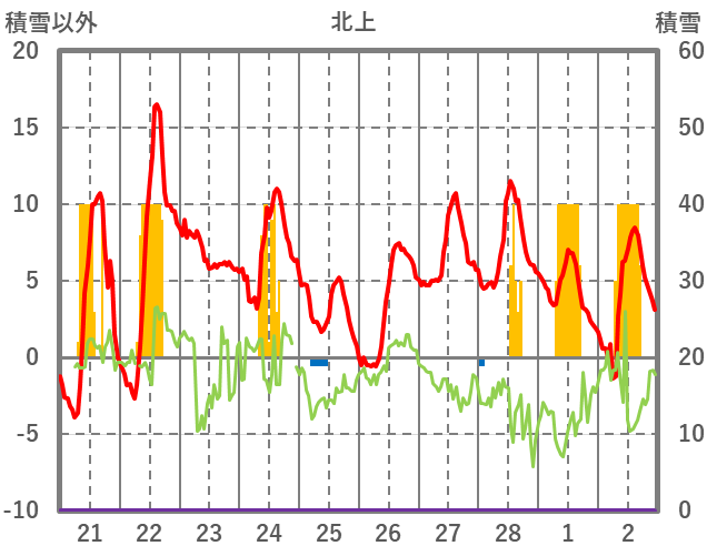 | 日 | 時 | 気温 | 降水 | 風向/風速 | 日照 | 積雪 | 降雪 |