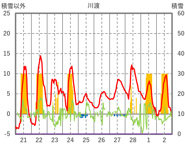 | 日 | 時 | 気温 | 降水 | 風向/風速 | 日照 | 積雪 | 降雪 |