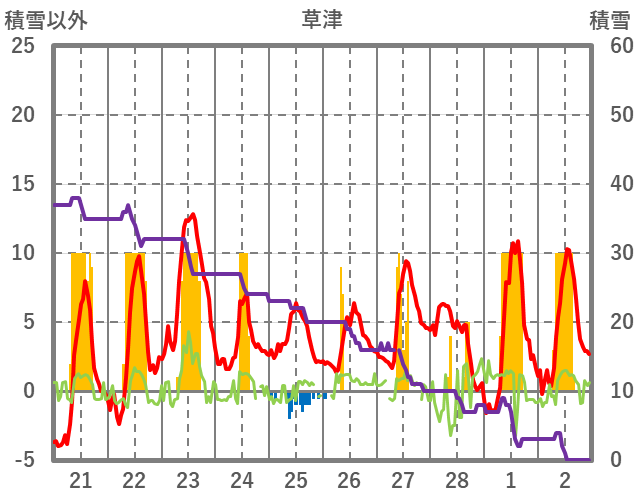 | 日 | 時 | 気温 | 降水 | 風向/風速 | 日照 | 積雪 | 降雪 |