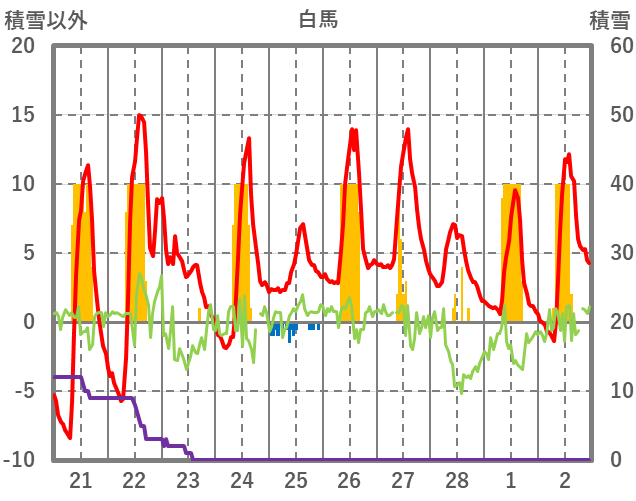 | 日 | 時 | 気温 | 降水 | 風向/風速 | 日照 | 積雪 | 降雪 |