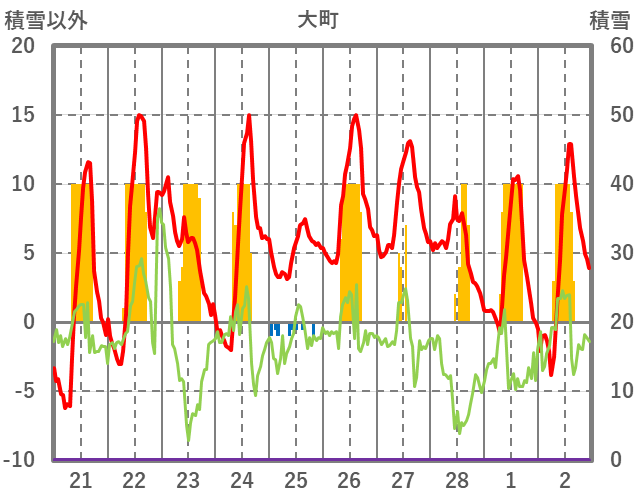 | 日 | 時 | 気温 | 降水 | 風向/風速 | 日照 | 積雪 | 降雪 |