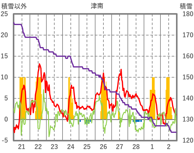 | 日 | 時 | 気温 | 降水 | 風向/風速 | 日照 | 積雪 | 降雪 |
