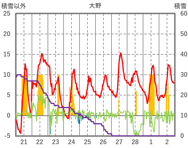 | 日 | 時 | 気温 | 降水 | 風向/風速 | 日照 | 積雪 | 降雪 |