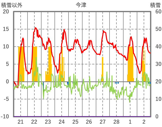 | 日 | 時 | 気温 | 降水 | 風向/風速 | 日照 | 積雪 | 降雪 |