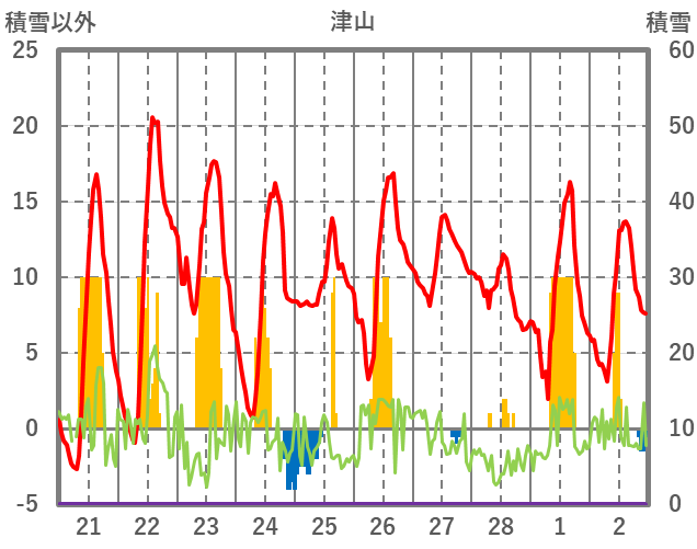 | 日 | 時 | 気温 | 降水 | 風向/風速 | 日照 | 積雪 | 降雪 |